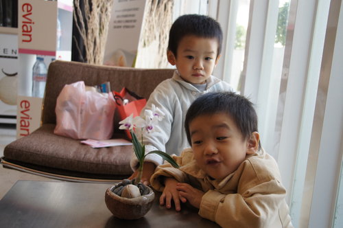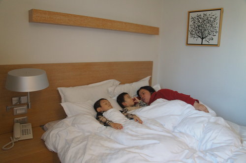 飯店雖然小, 但, 很便利...床也很好睡, 隔天小姨去考試, 媽咪和雙胞胎硬又是在飯店床上,