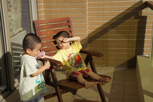 陽台, 這天還有看到陽光, 兩孩子車也坐了一天, 沒啥活力 !!