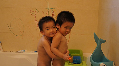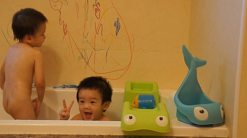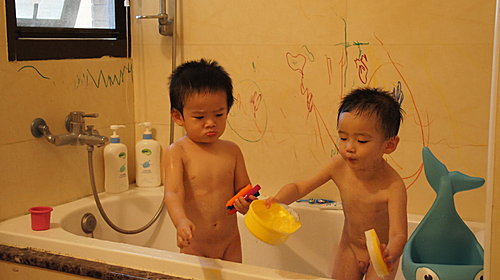 兩小子, 吵著玩水, 媽咪去買了洗澡蠟筆....真的蠻好玩的, 要是磁磚是白的就更好了 !!