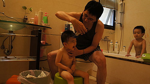 弟弟被爸爸抓去剪頭髮了.....不甘願的一直亂叫一通....