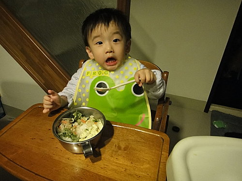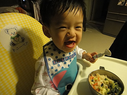 但, 都兩歲多了, 還是得給他們自行吃飯, 天氣也不熱了...這是二姑姑買的圍兜兜哦...