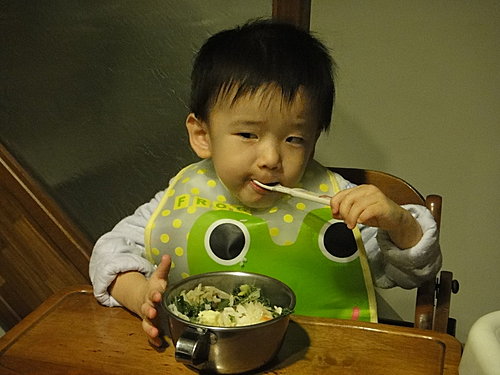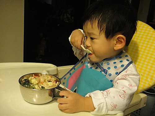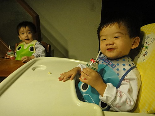 小帥很愛自己吃飯, 竟然吃的比哥哥快哦....平常都不愛吃飯, 那天吃的可快的咧.....